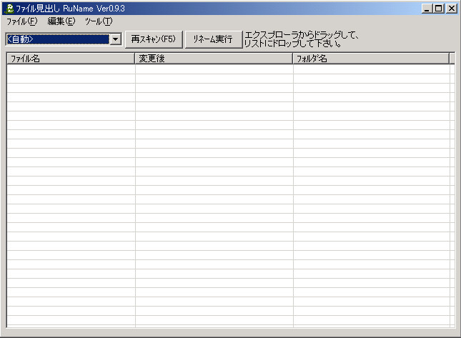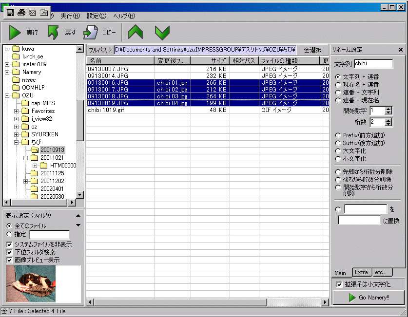 Junさん作成のリネームソフトです。 大変多機能で、いろいろなパターンでリネームできます。 機能(ver4.05β) 文字列追加(開始場所と桁も選べます) 文字列+連番 現在名+連番 連番+文字列 連番+現在名 基本フォルダ名+文字列+連番 相対フォルダ名+文字列+連番 相対フォルダ名+文字列+現在名 連番+文字列+基本フォルダ名 連番+文字列+相対フォルダ名 前方追加・後方追加 先頭文字を大文字化 大文字化・小文字化 文字列挿入(場所が指定できます) 桁数分削除(先頭から・後ろから) 前から・後ろから~まで削除(文字を打ち込める) ~を~に変換(置換) 拡張子を変更・削除・大文字化・小文字化 英単語を区切って整形 ファイルの日付を付加(前方・後方) 半角を全角にする 全角を半角にする 全角カナをひらがなにする ひらがなを全角カナにする 全角英字を半角にする 数字を半角にする タイムスタンプを変更する 属性を変更する(ReadOnly Hidden Archive System) こんなにいろいろできます。 ファイル名の変更後も確認でき、元にも戻せます。 画像プレビューも付いてますので、デジカメ画像のファイル名整理にもよさそうです。 直感的に使えますので、ぜひ使ってみてください。 |